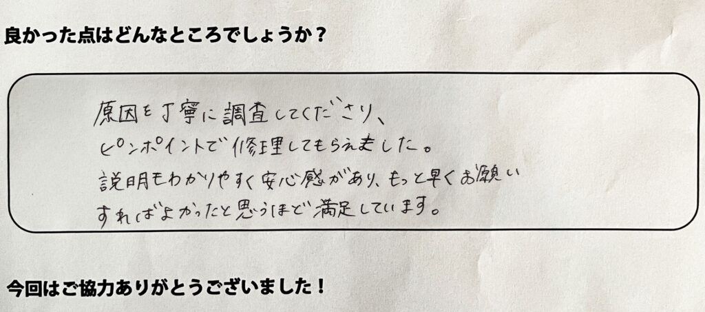 原因を丁寧に調査してくださり、ピンポイントで修理してもらえました。説明もわかりやすく安心感があり、もっと早くお願いすればよかったと思うほど満足しています。