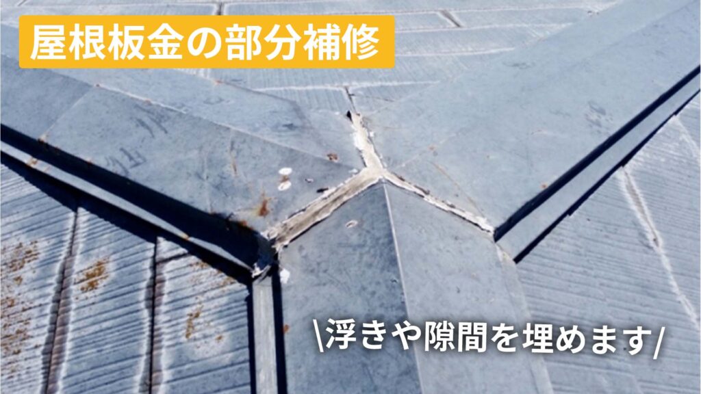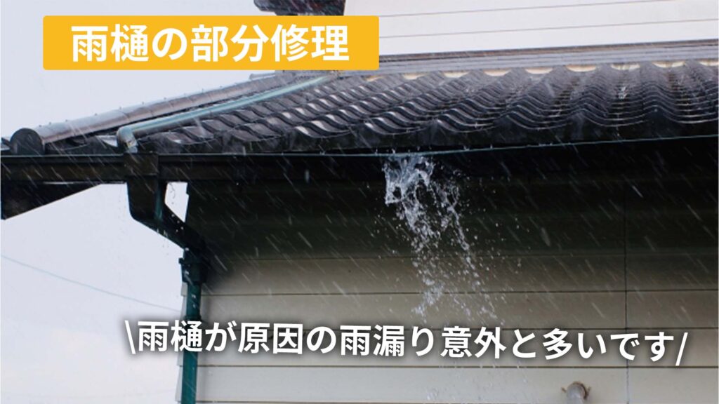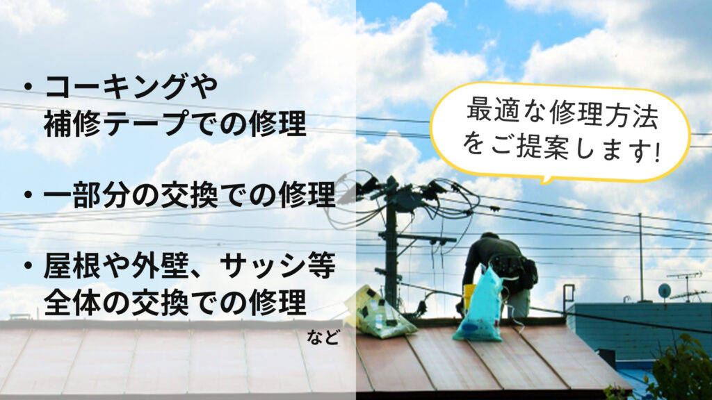 当社が提供している「雨漏り修理プラン」は部分的な修理から全体の交換修理まで対応した雨漏り修理に特化したサービスとなっております。部分的な修理では出来るだけ足場を使わないように梯子や脚立、もしくは屋根に登らせてもらい修理を行います。出来るだけコストを抑えた修理方法をご提案しております。