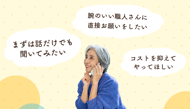 当社はお客様のお悩みを伺い、実績豊富で信頼できる大工さん・職人さんを派遣する独自のシステムを構築しています。迅速かつ適切にお悩みを解決いたしますので、まずはお気軽にご相談ください。