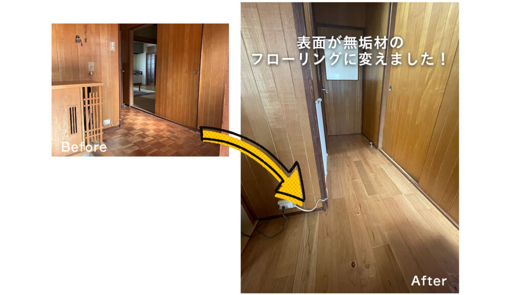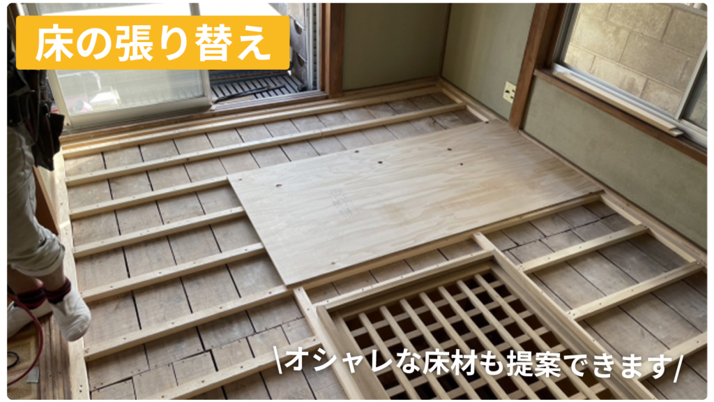 既存の床を補強しつつ、上に新しくフローリングを張りました。