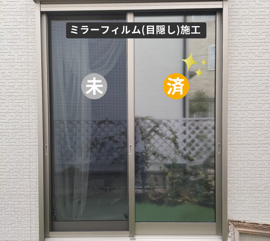 外からは室内が見えず、室内からは外が見えるようなミラーフィルムや、内外ともに見えなくなるすりガラスフィルム、段々と見え方が変わるグラデーションフィルムがあります。