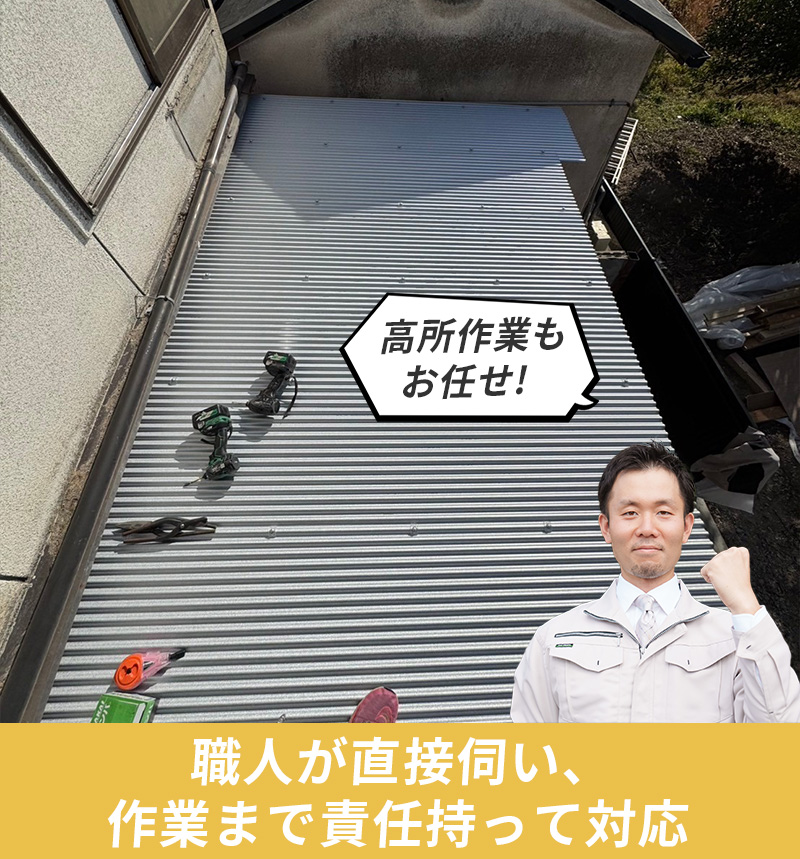 メッセージ:波板は雨や風から暮らしを守る大切な屋根材の一つです。しかし経年劣化で割れたり、台風で飛ばされたり、雨漏りにつながることもあります。「見た目が気になるけど放置してしまっている」「どこに頼めばいいのかわからない」「高所作業が心配」——そんな声を多く伺います。私たちは、地域で実績を積んだ職人さんと直接つながれる体制を整え、安心してご依頼いただける環境をご用意しています。一軒一軒の状態やご要望に合わせ、無理なく安全に、丁寧な修理をご提案します。暮らしに寄り添う屋根だからこそ、「頼んでよかった」と思っていただけるよう、誠実に対応いたします。まずはお気軽にご相談ください。